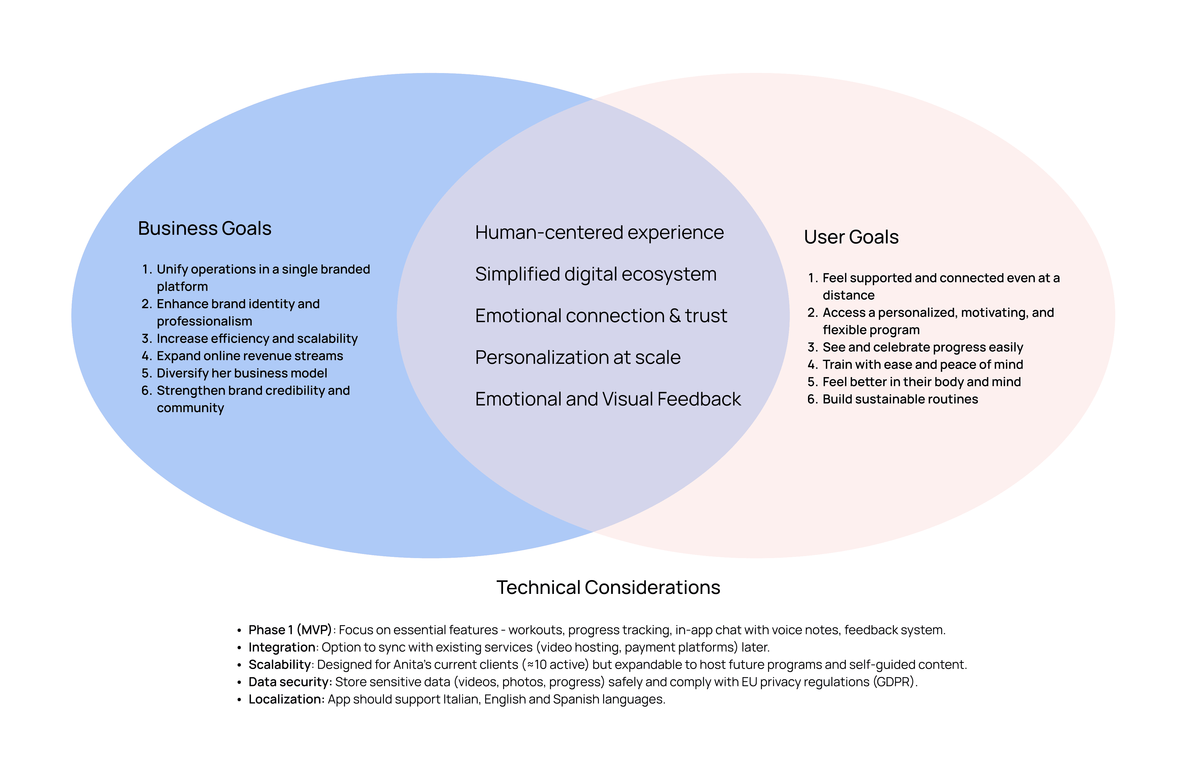 Balancing coach and client needs led to a clear set of shared goals: unify Anita's workflow while delivering a supportive, personalized experience that keeps users motivated.