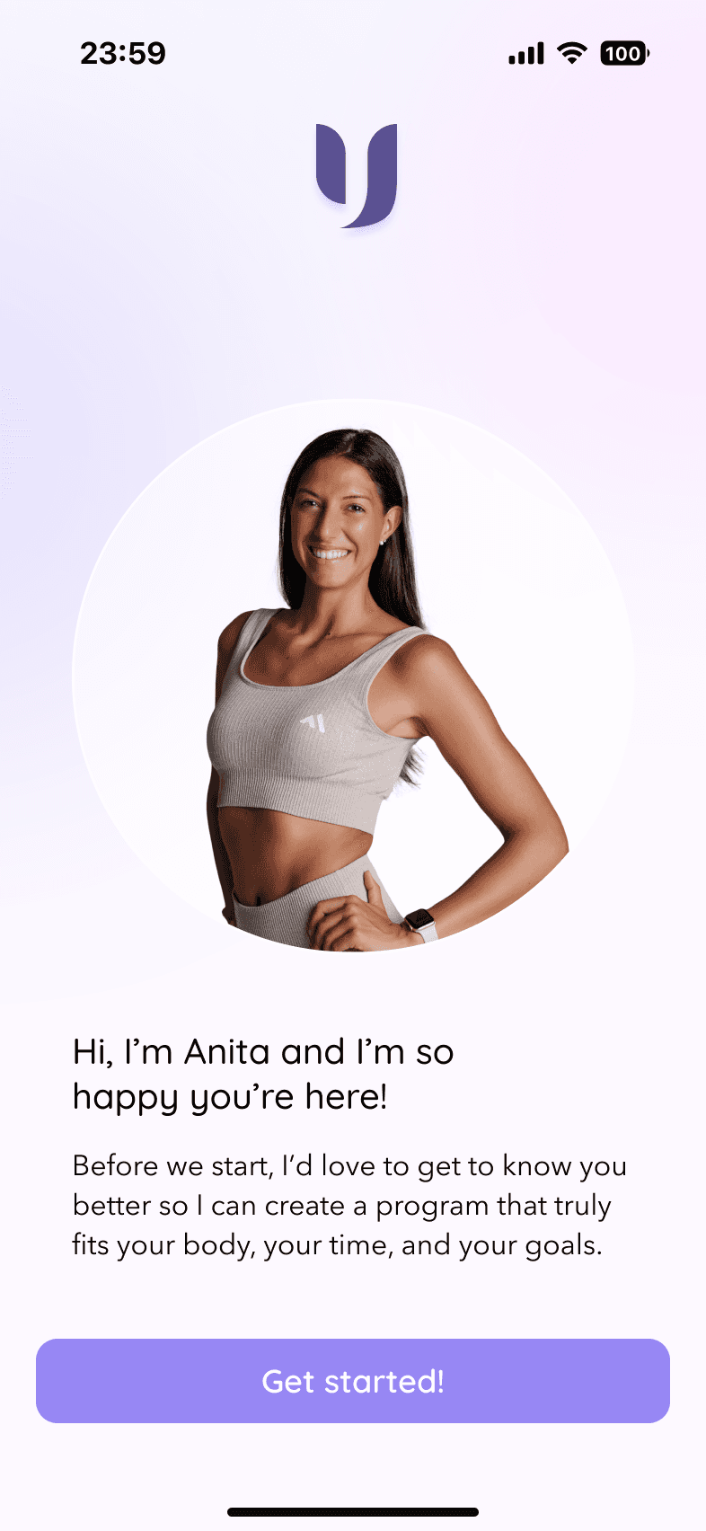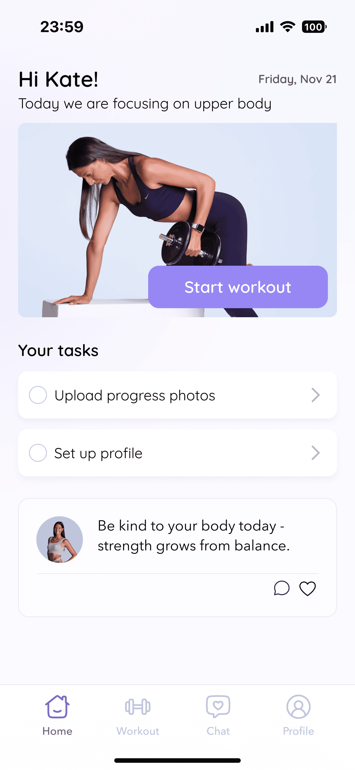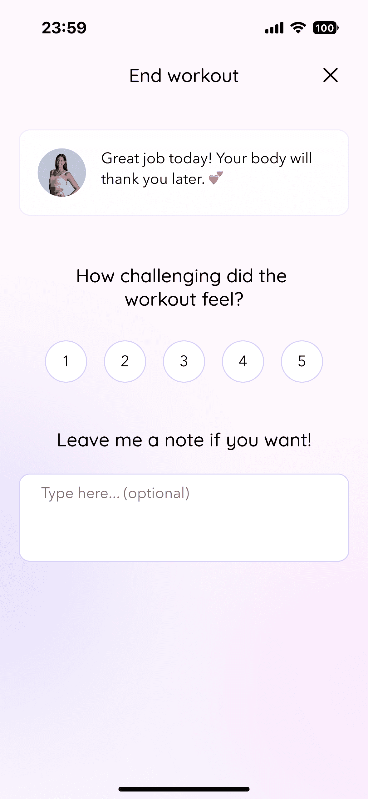 Her own images and videos appear throughout the app — making it feel like she's there with users during their workouts. Soft gradients add warmth, bold accents guide attention during key actions, and the overall tone stays calm and supportive rather than clinical or transactional.