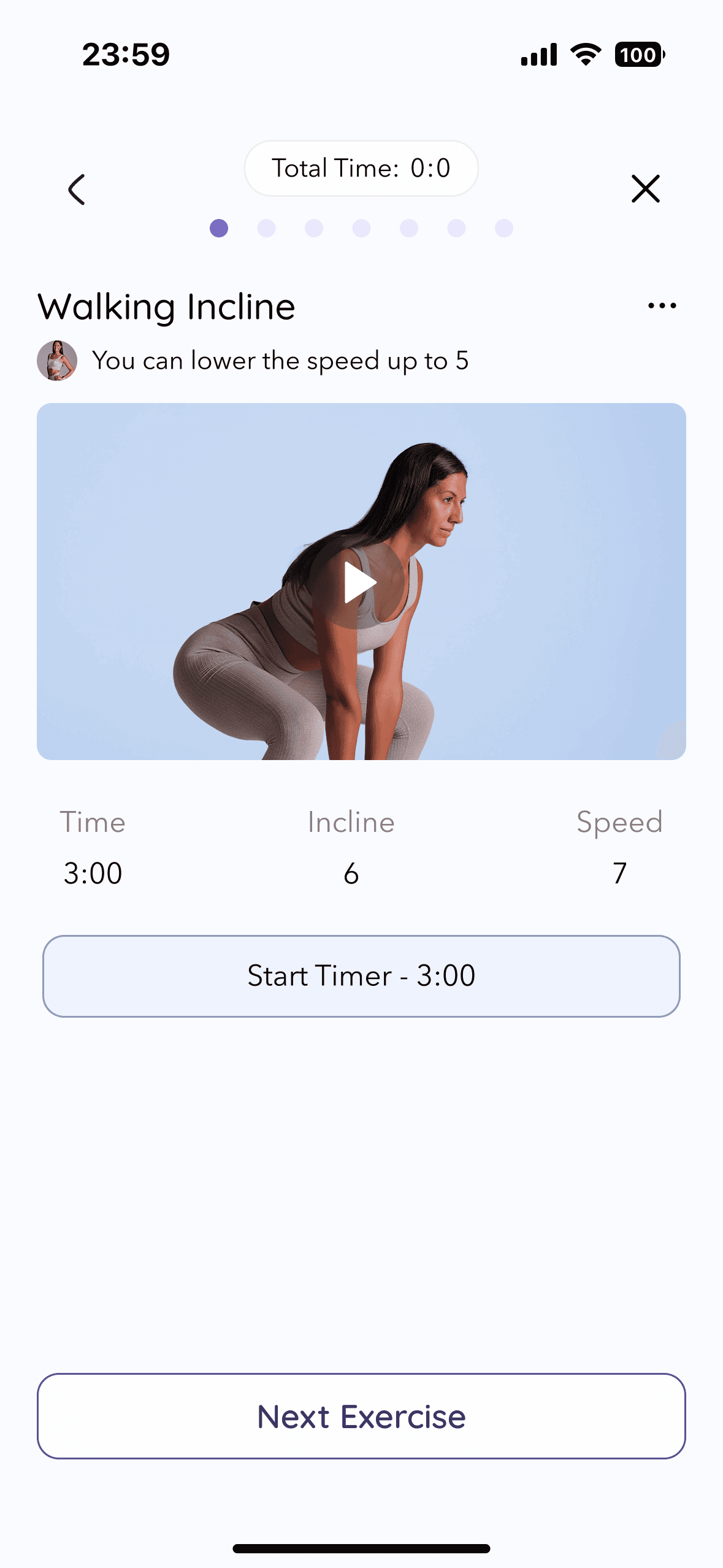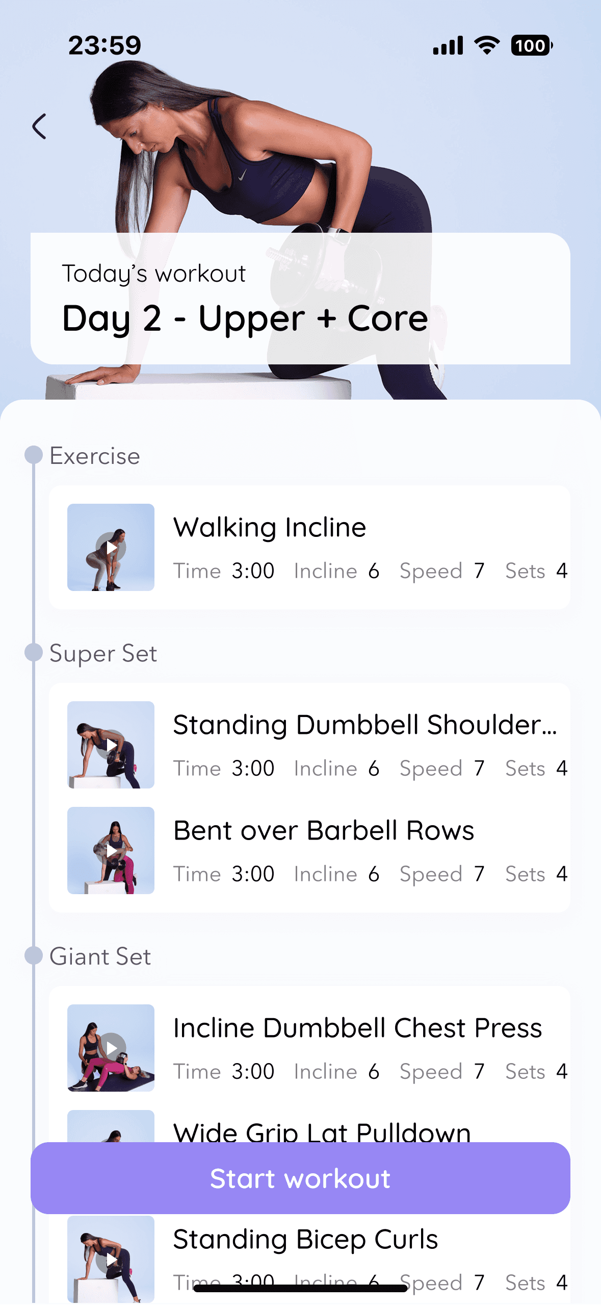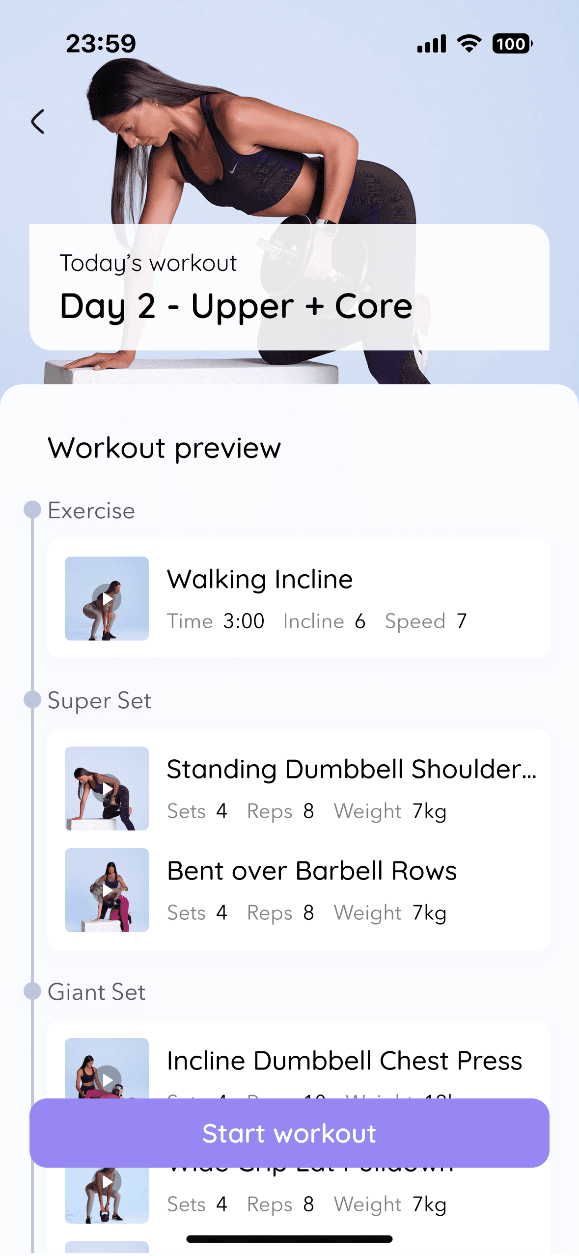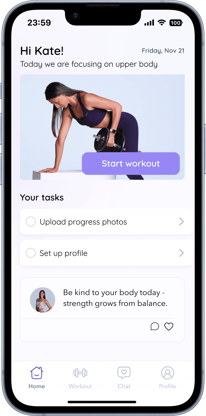 Her own images and videos appear throughout the app — making it feel like she's there with users during their workouts. Soft gradients add warmth, bold accents guide attention during key actions, and the overall tone stays calm and supportive rather than clinical or transactional.