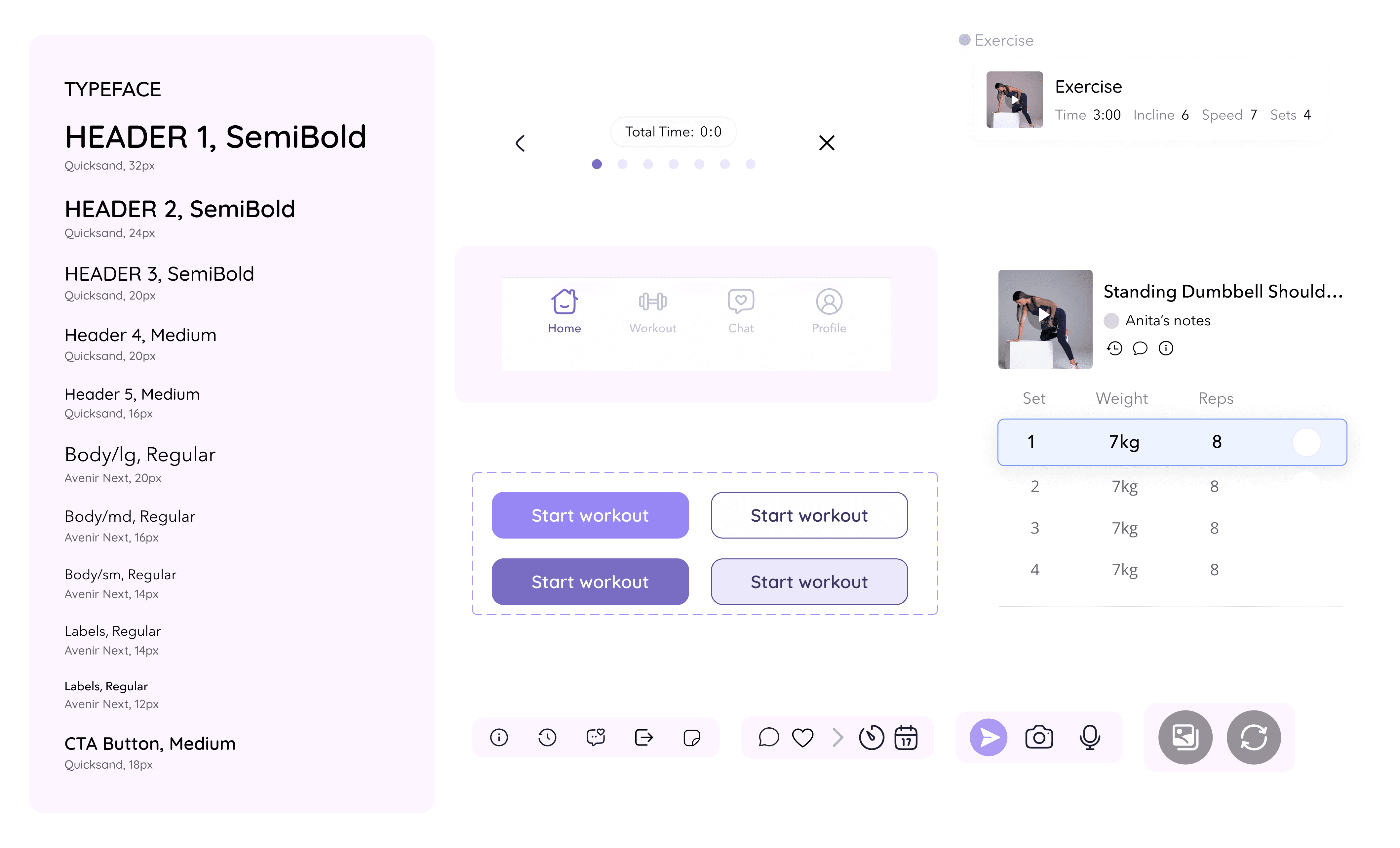 The brand system directly informed the UI - rounded shapes reinforce approachability, soft purples create emotional safety, and bold accents guide attention during workouts. Typography balances warmth and clarity, ensuring the interface feels supportive rather than clinical.