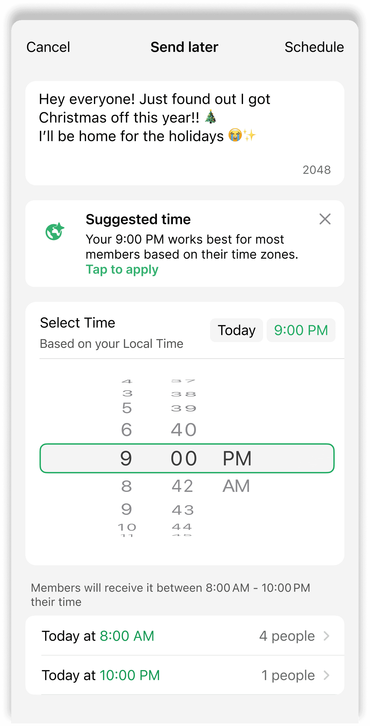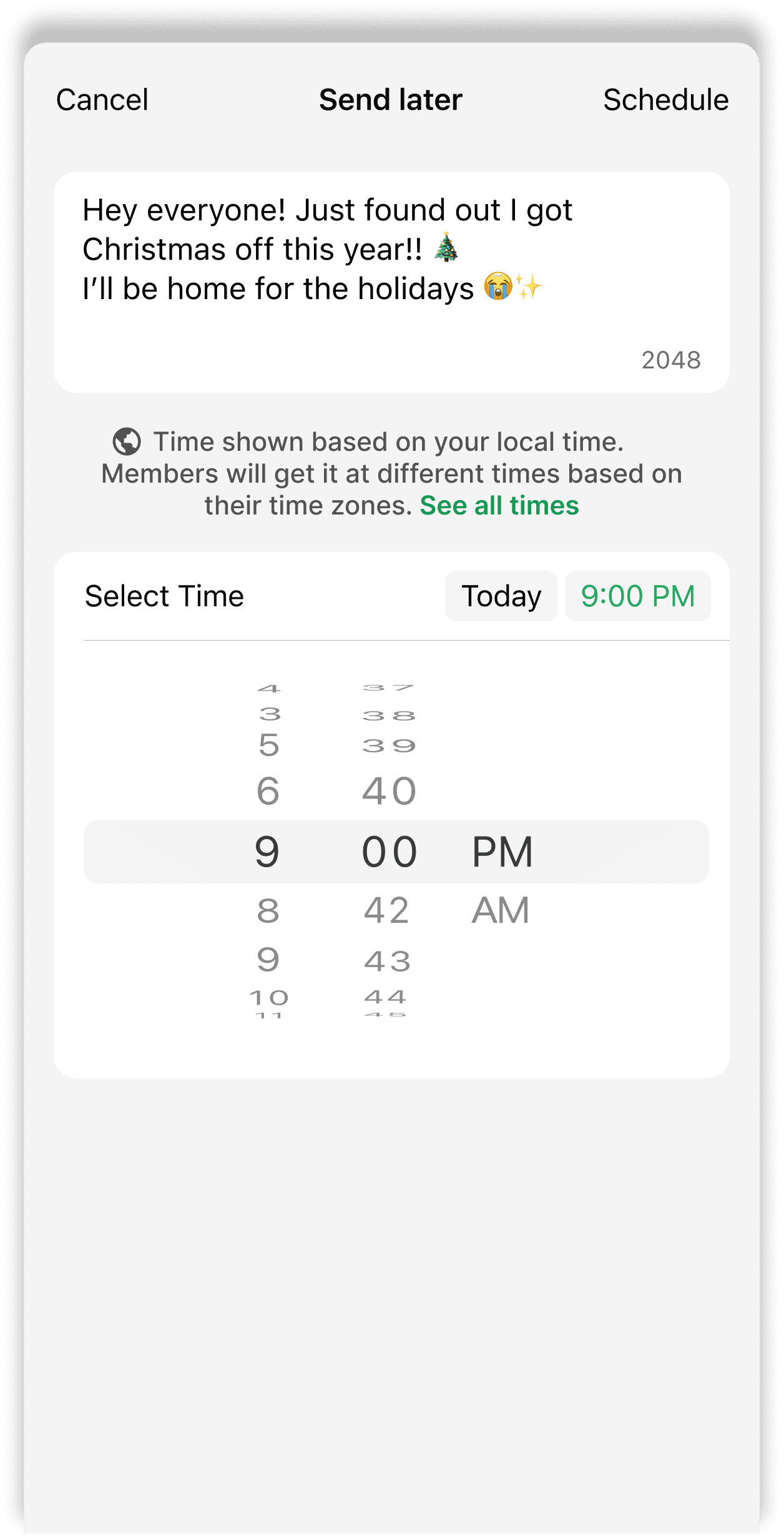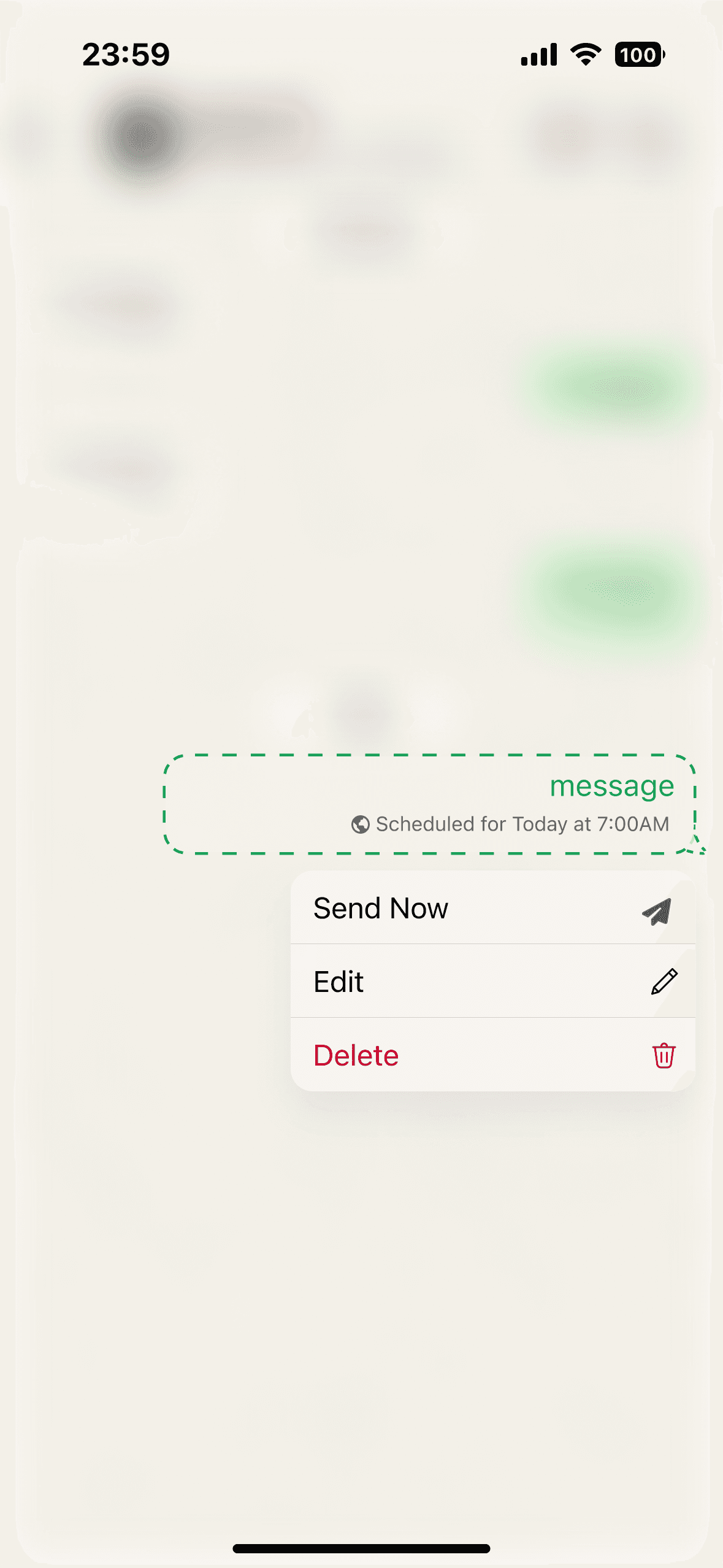 This prototype tested the "+" attachment menu entry point, where "Send Later" appeared alongside other optional actions like polls and location. After scheduling through the same dual-time picker, a lightweight inline message bubbleappeared in the chat timeline ("Scheduled for tomorrow 9:00 AM"), directly integrated into the conversation flow. Users could tap or long-press the bubble to edit, reschedule, send now, or delete.
