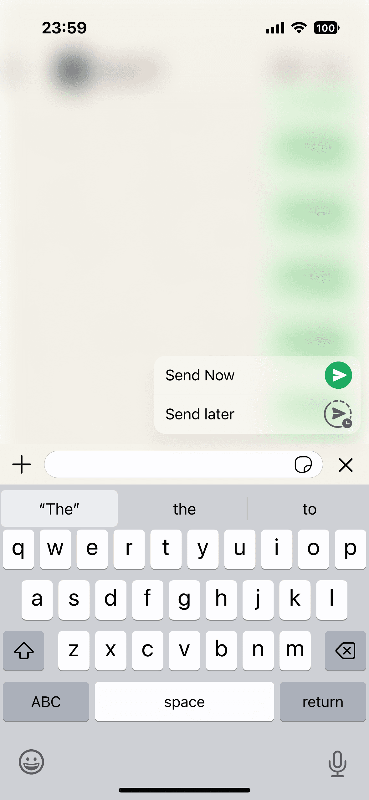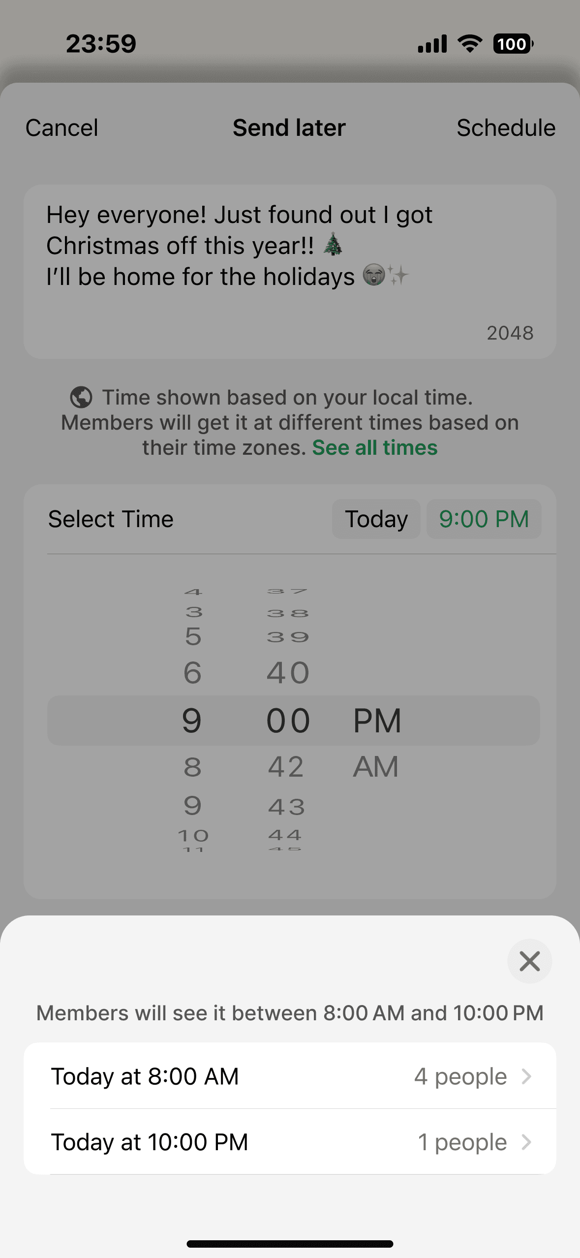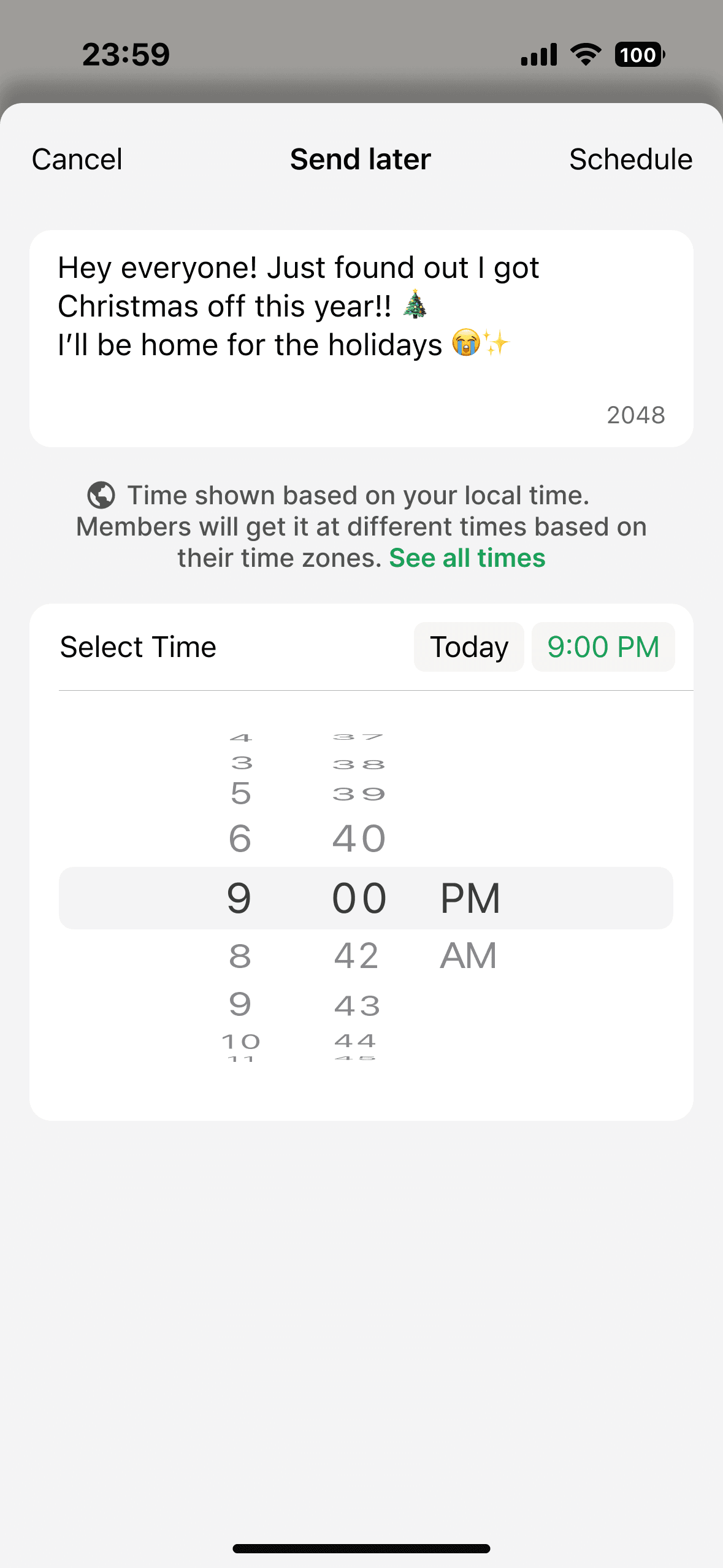 This prototype tested the "+" attachment menu entry point, where "Send Later" appeared alongside other optional actions like polls and location. After scheduling through the same dual-time picker, a lightweight inline message bubbleappeared in the chat timeline ("Scheduled for tomorrow 9:00 AM"), directly integrated into the conversation flow. Users could tap or long-press the bubble to edit, reschedule, send now, or delete.