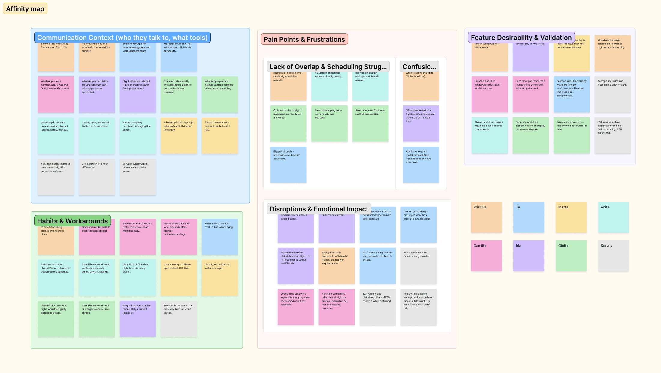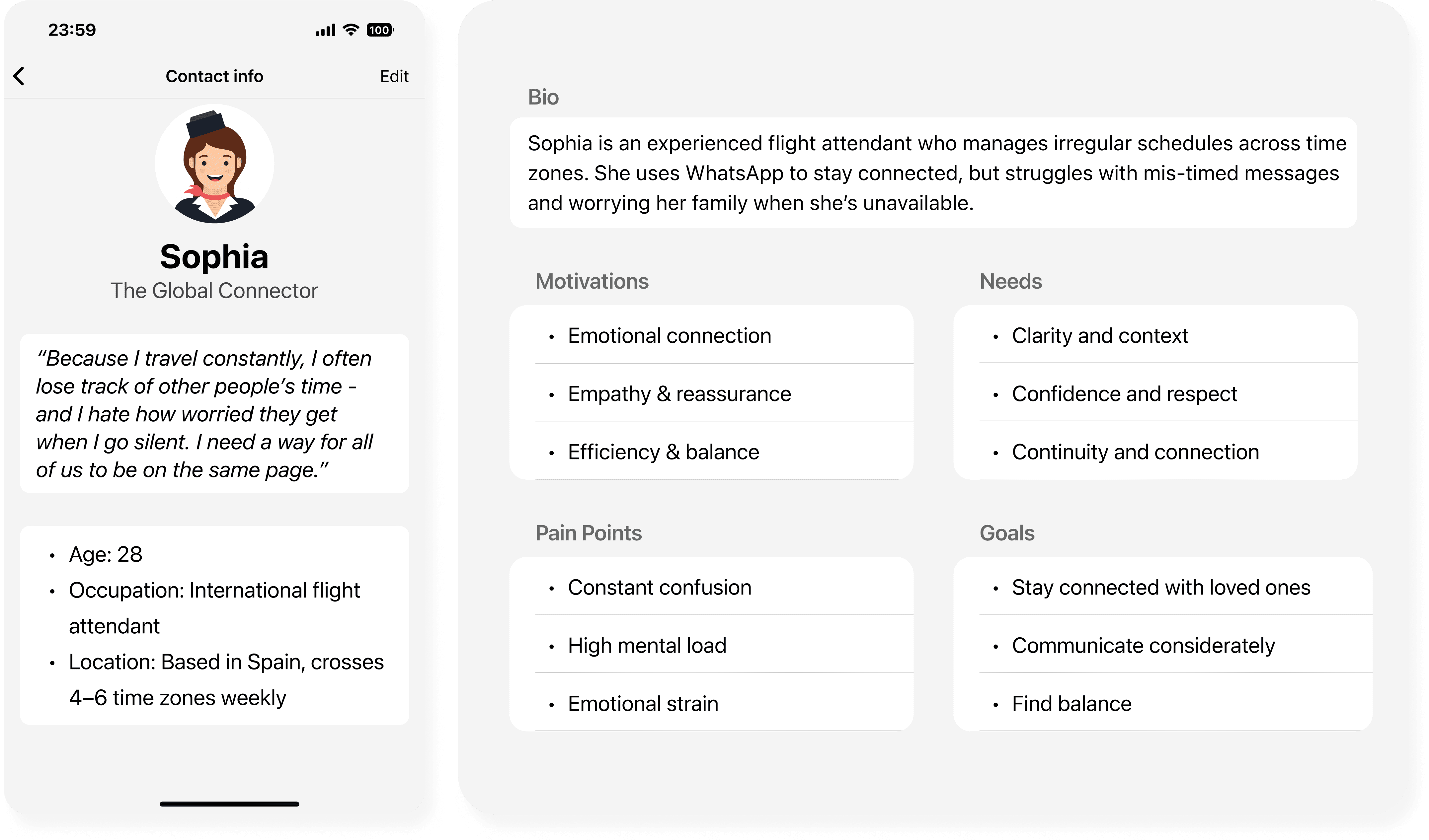 To keep the findings human and relatable, I brought the research to life through Sophia who represented users trying to maintain close relationships while juggling unpredictable schedules across timezones.