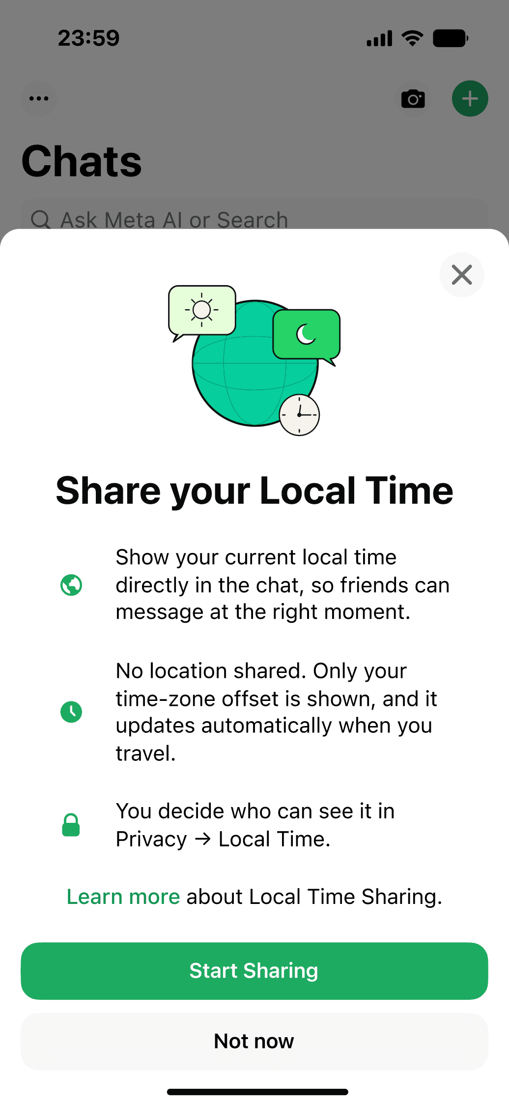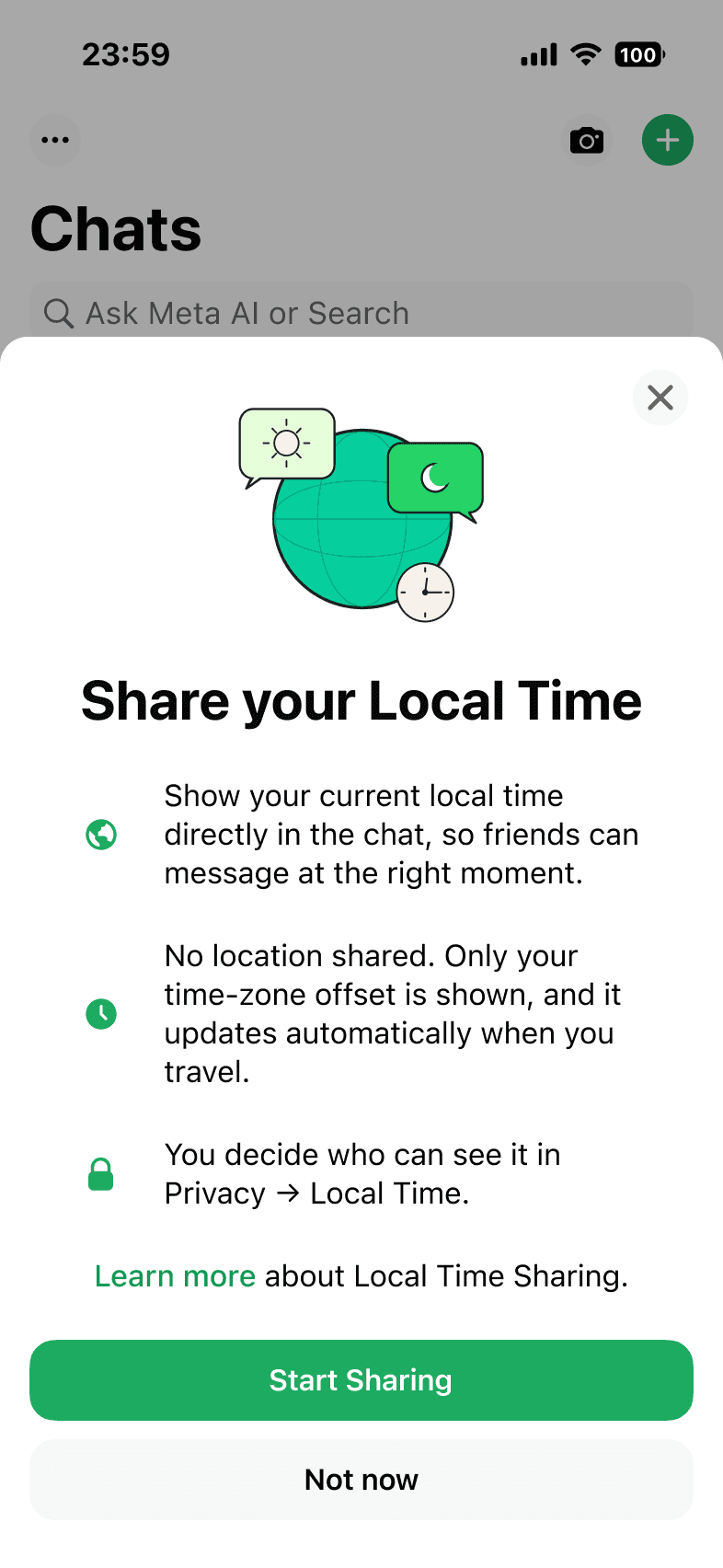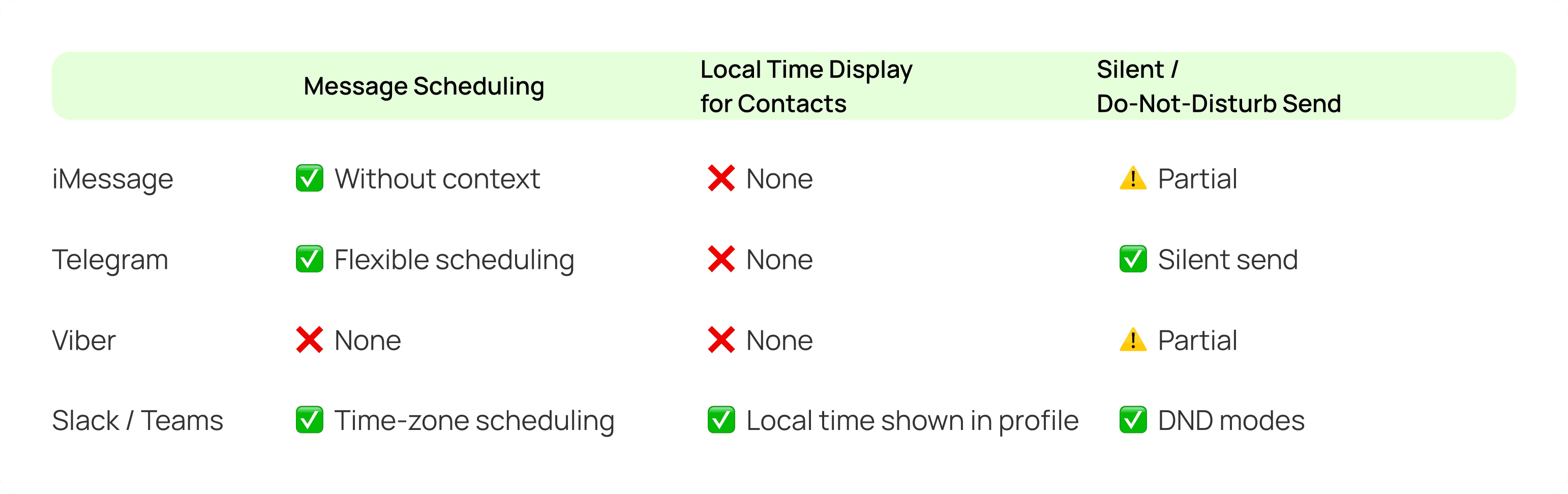 → No major personal messaging app shows a contact’s local time directly in chat. This gap positions WhatsApp to become the first truly time-aware messaging platform.