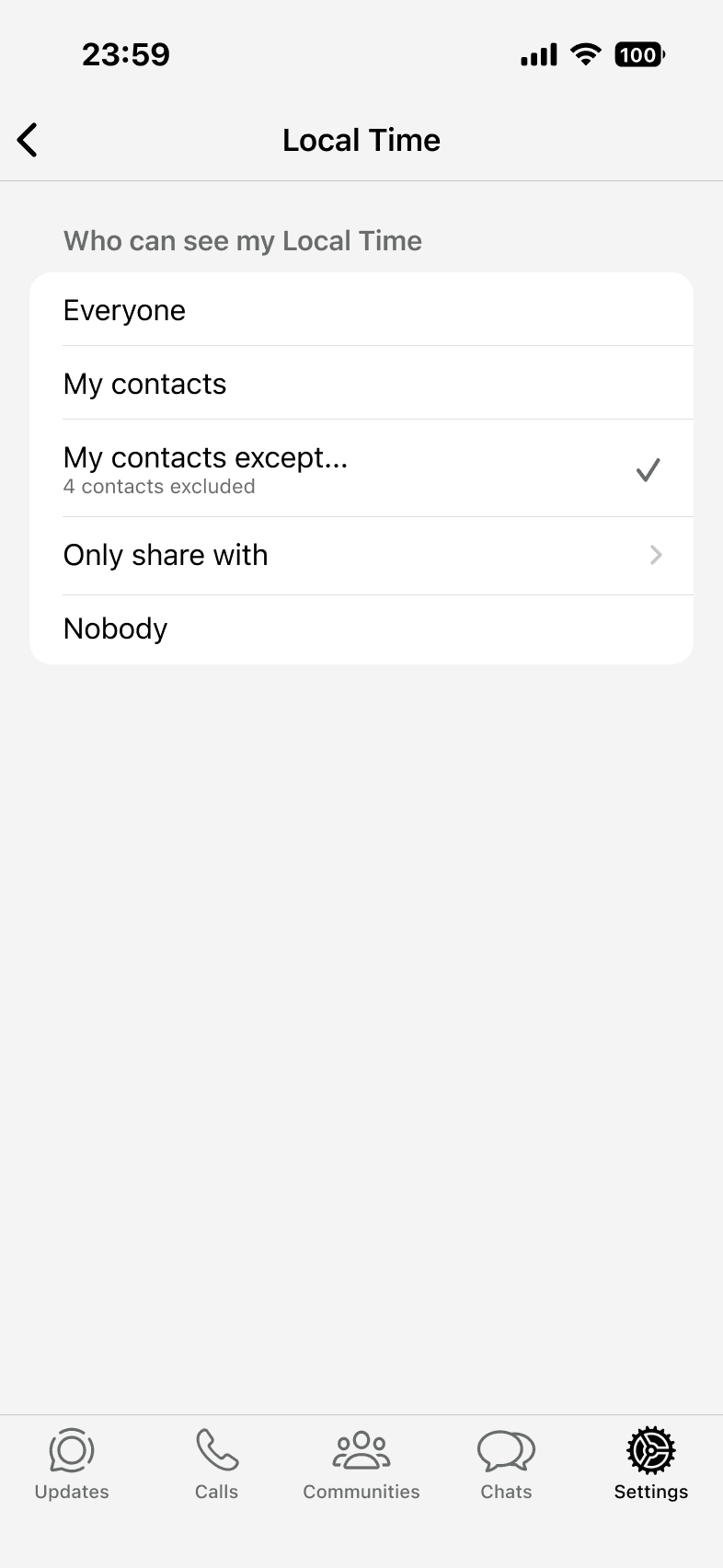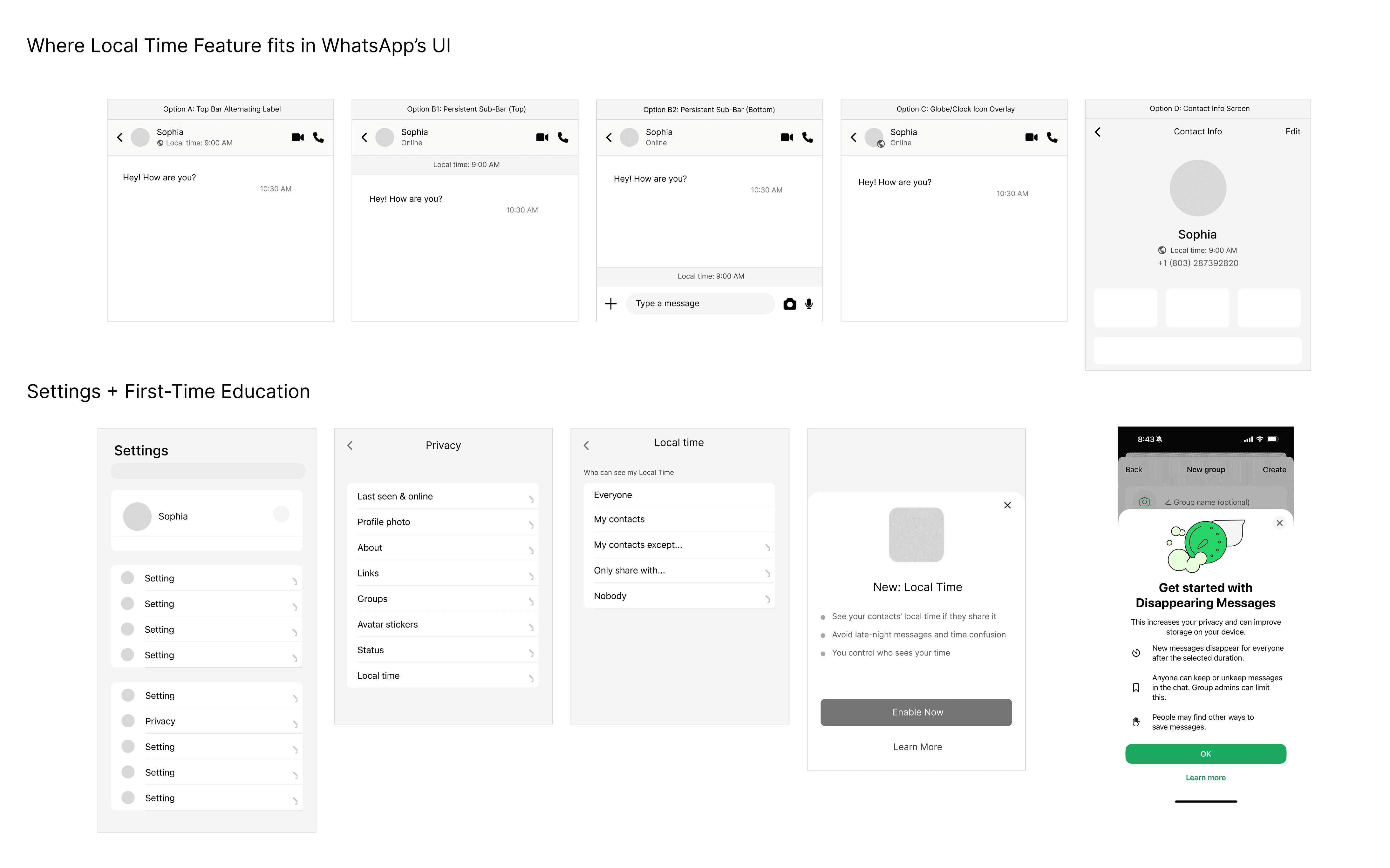 This prototype focused exclusively on the local time feature. Users encountered the alternating header label (contact name ⇄ "Local time: 9:00 AM") in an open chat, with a bottom sheet education flow explaining the feature on first use. The settings flow was placed under Settings → Privacy, using WhatsApp's standard audience controls (Everyone, My Contacts, My Contacts Except..., Only Share With..., Nobody) to manage time-sharing visibility.