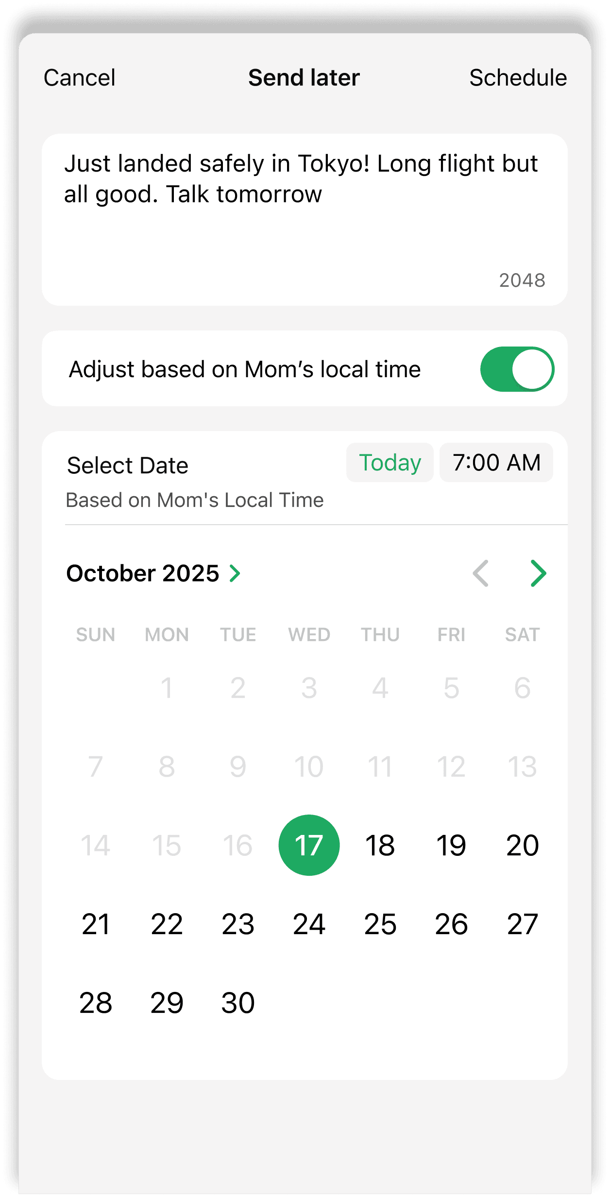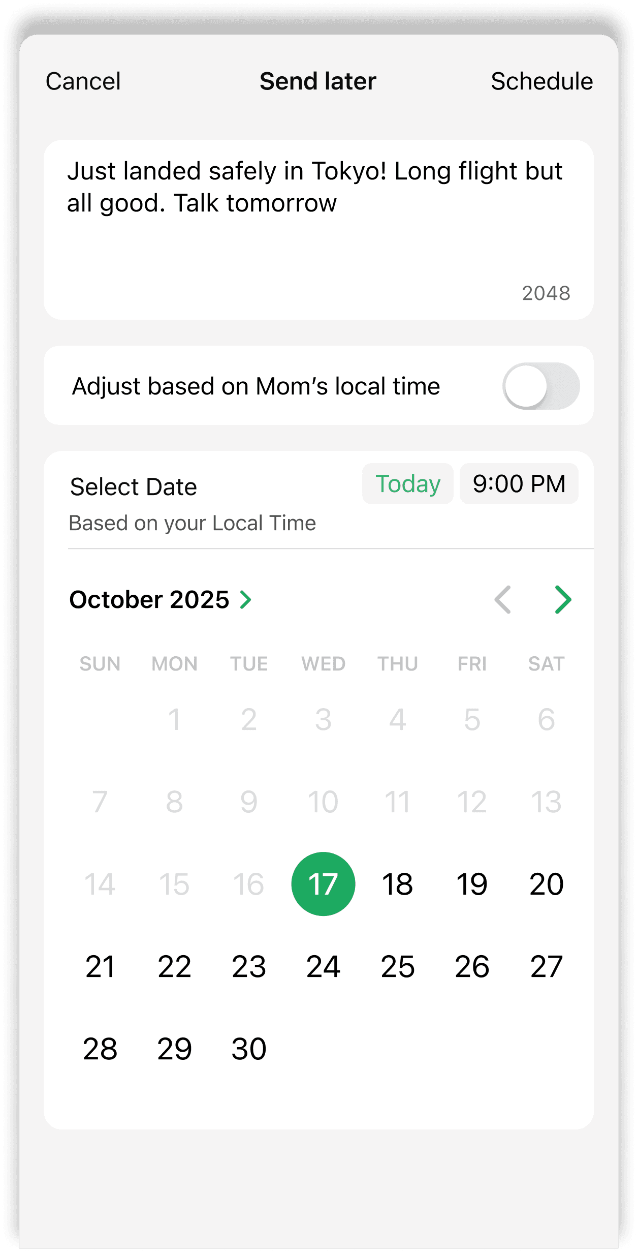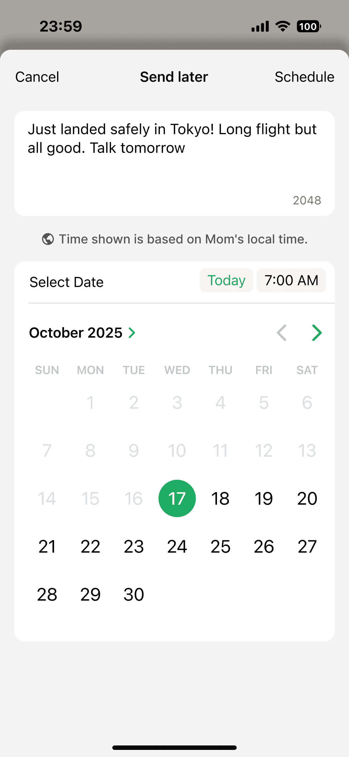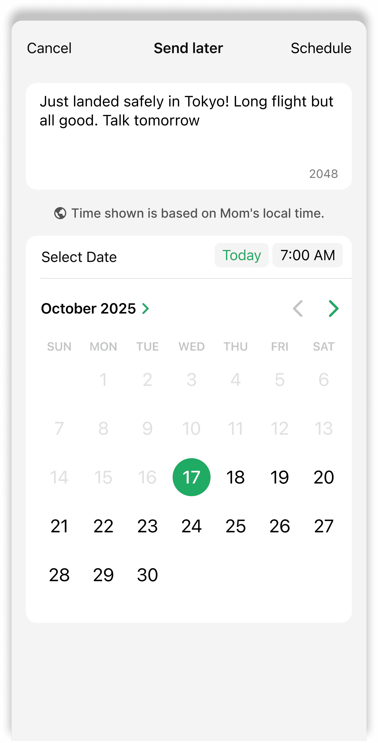 I delivered a refined, high-fidelity solution that makes cross-time-zone messaging feel seamless. Through local time awareness and flexible scheduling, this project transforms “Is it too late to text?” into confident, respectful connection.